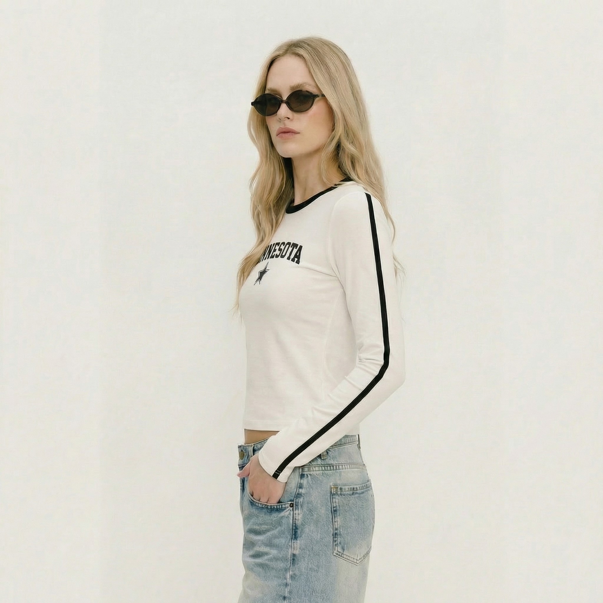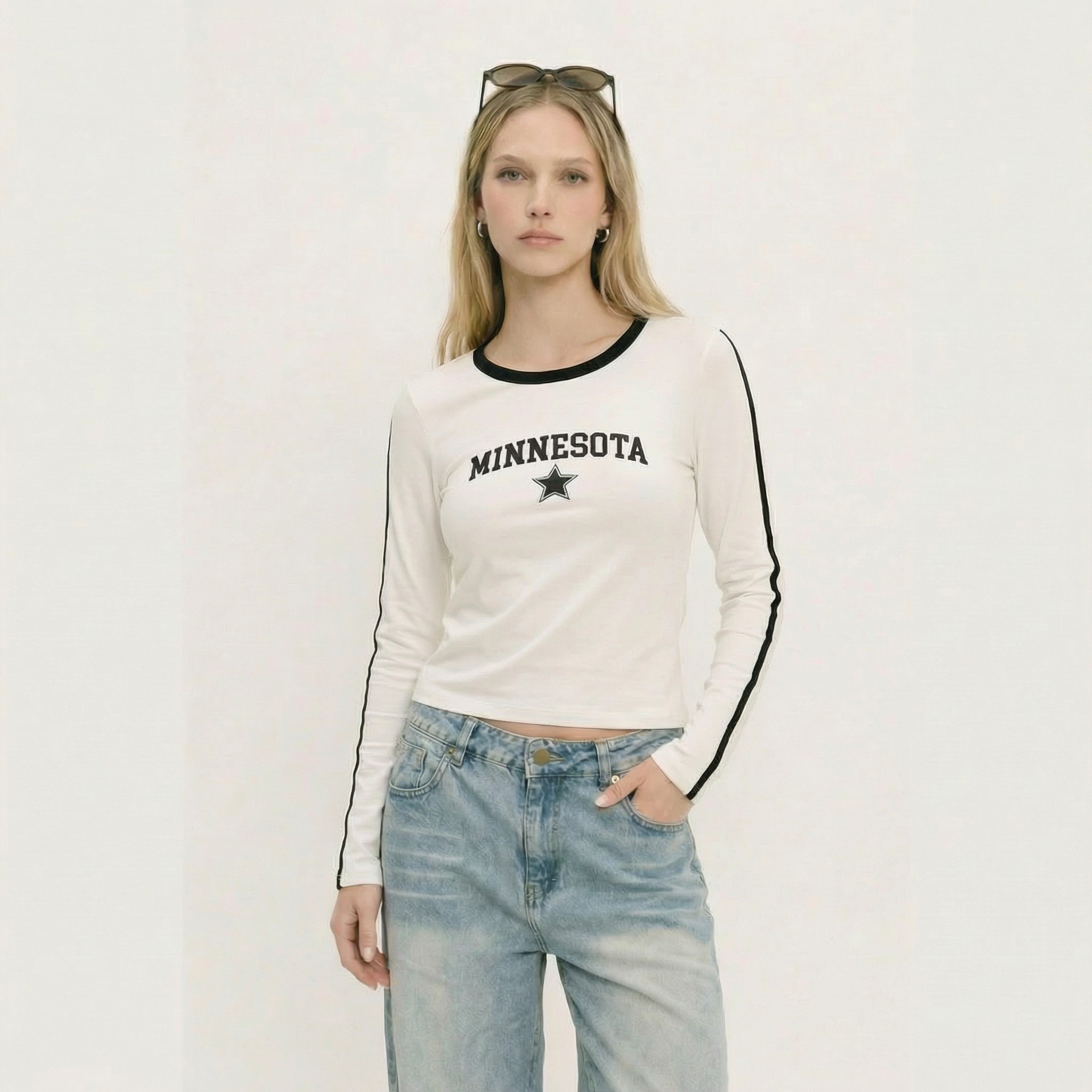 Remera de Ribb, manga larga con vivo, combinada y estampada.