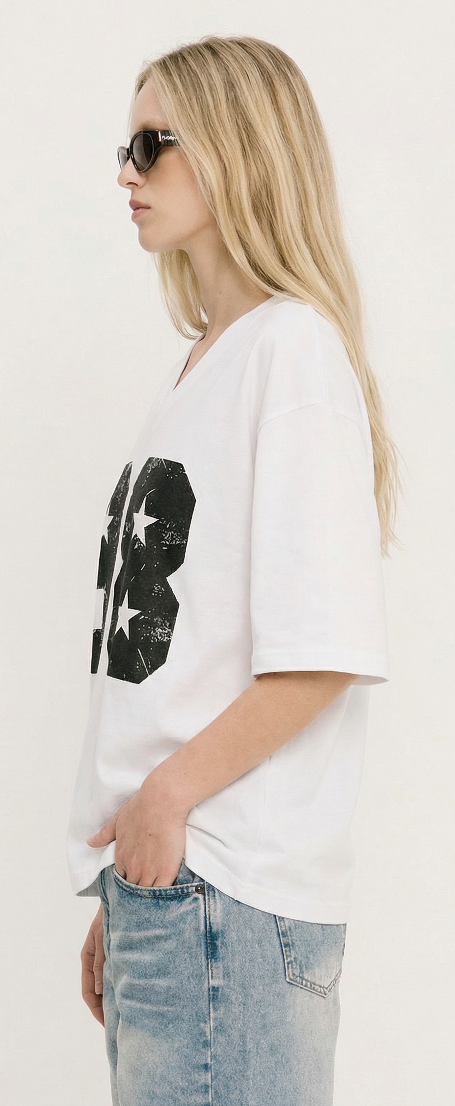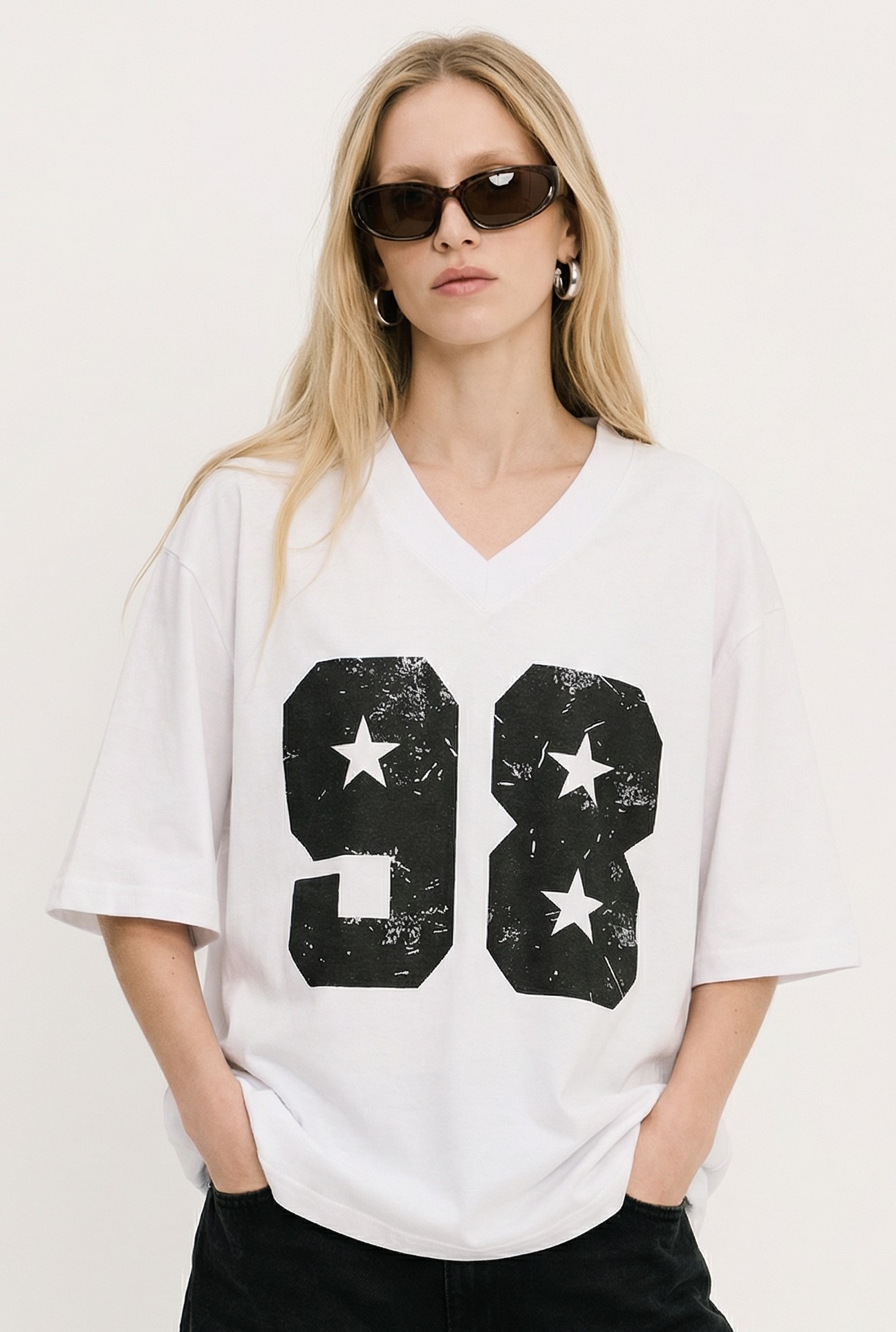 Remera de Jersey, manga corta, esc v y estampada.