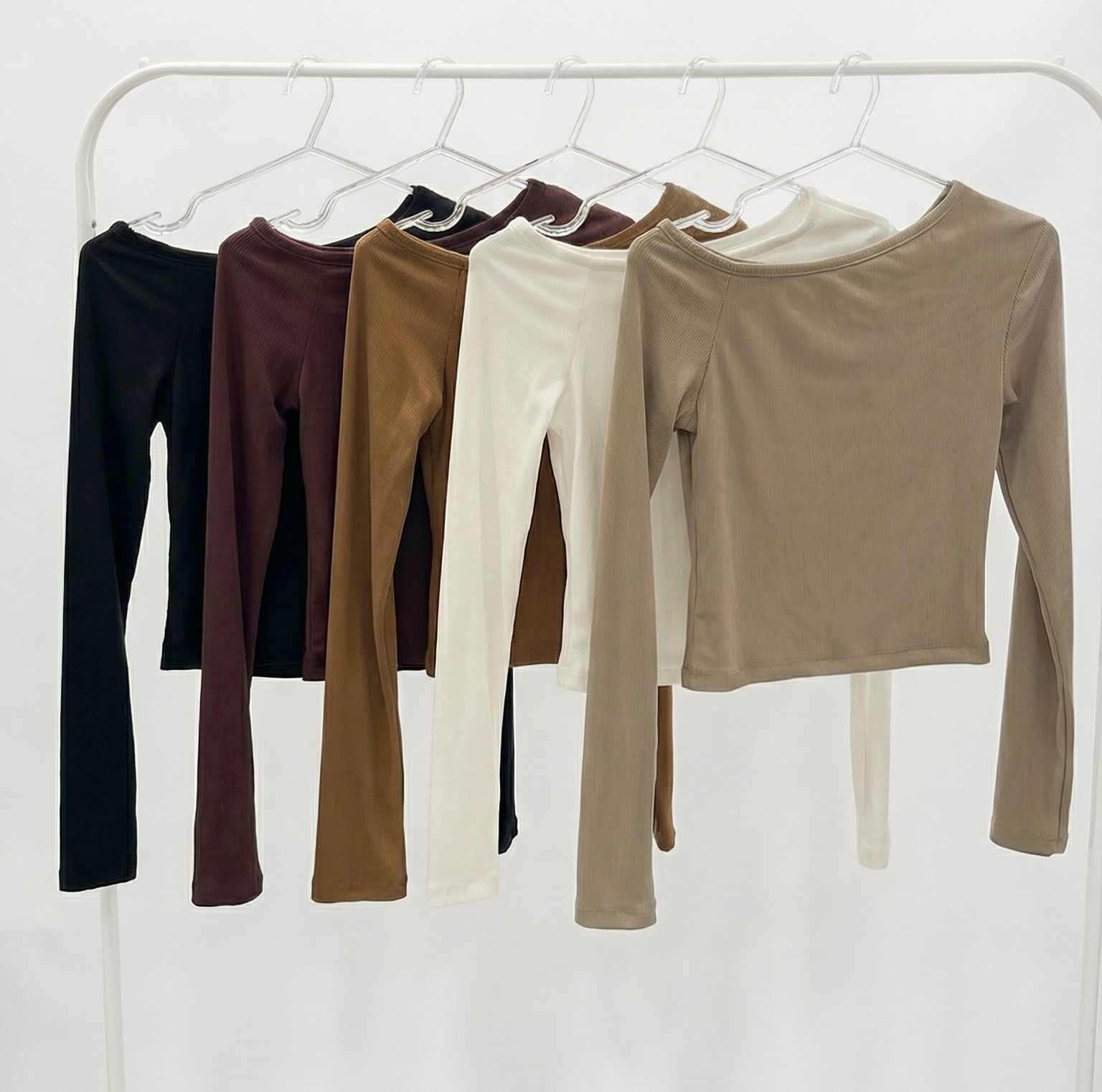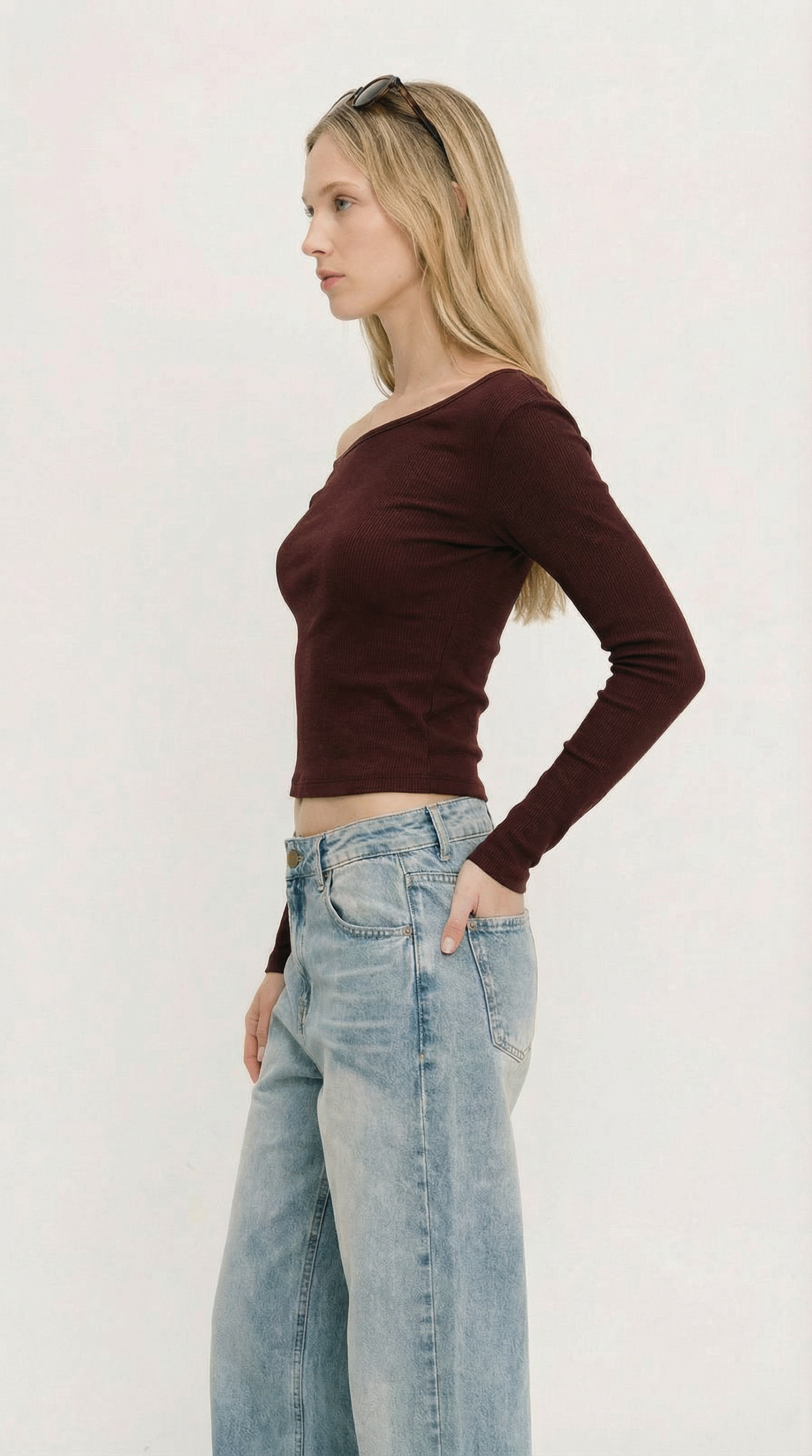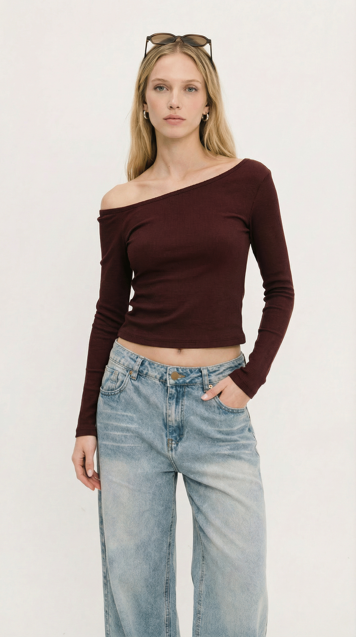 Remera de Morley, manga larga, 1 hombro descubierto.