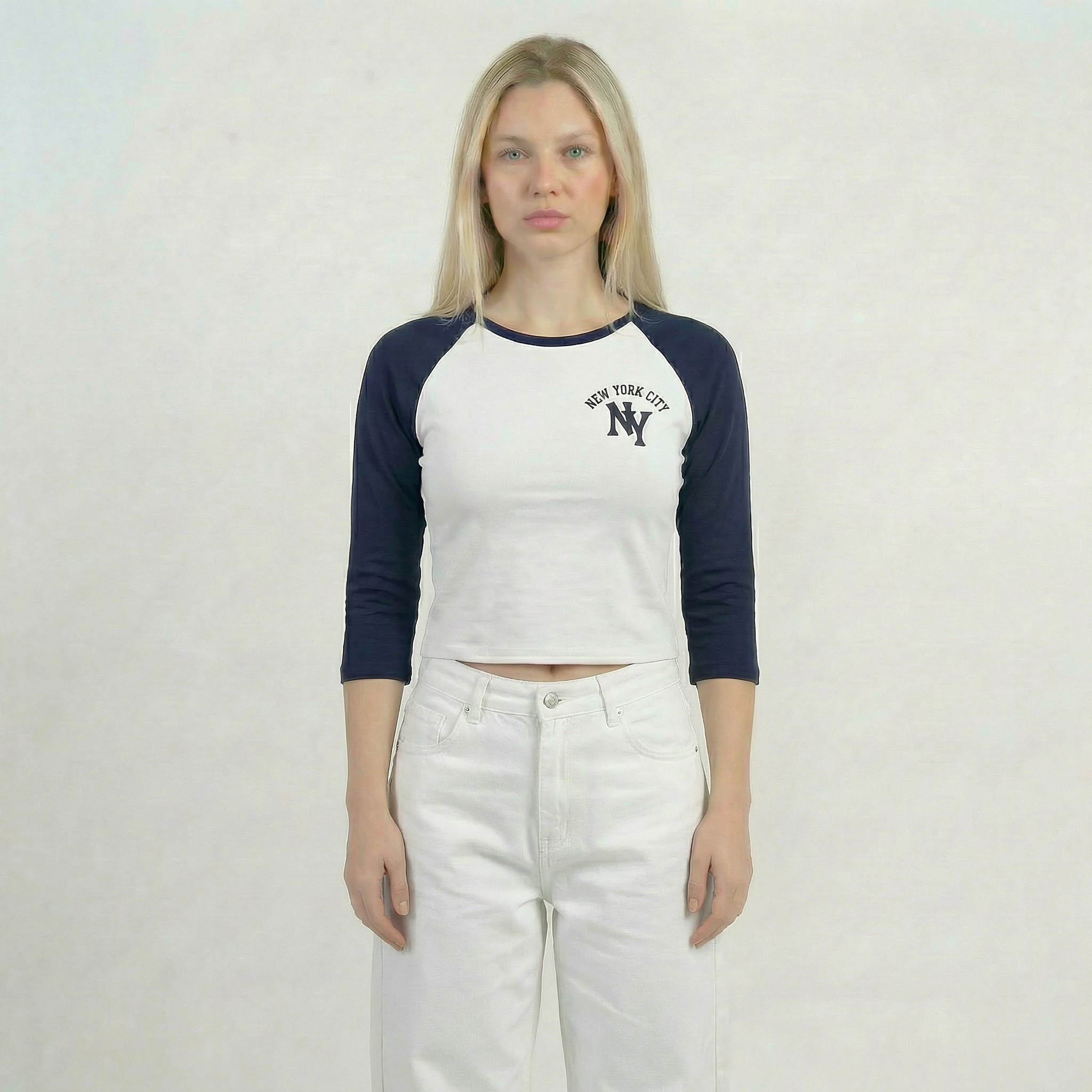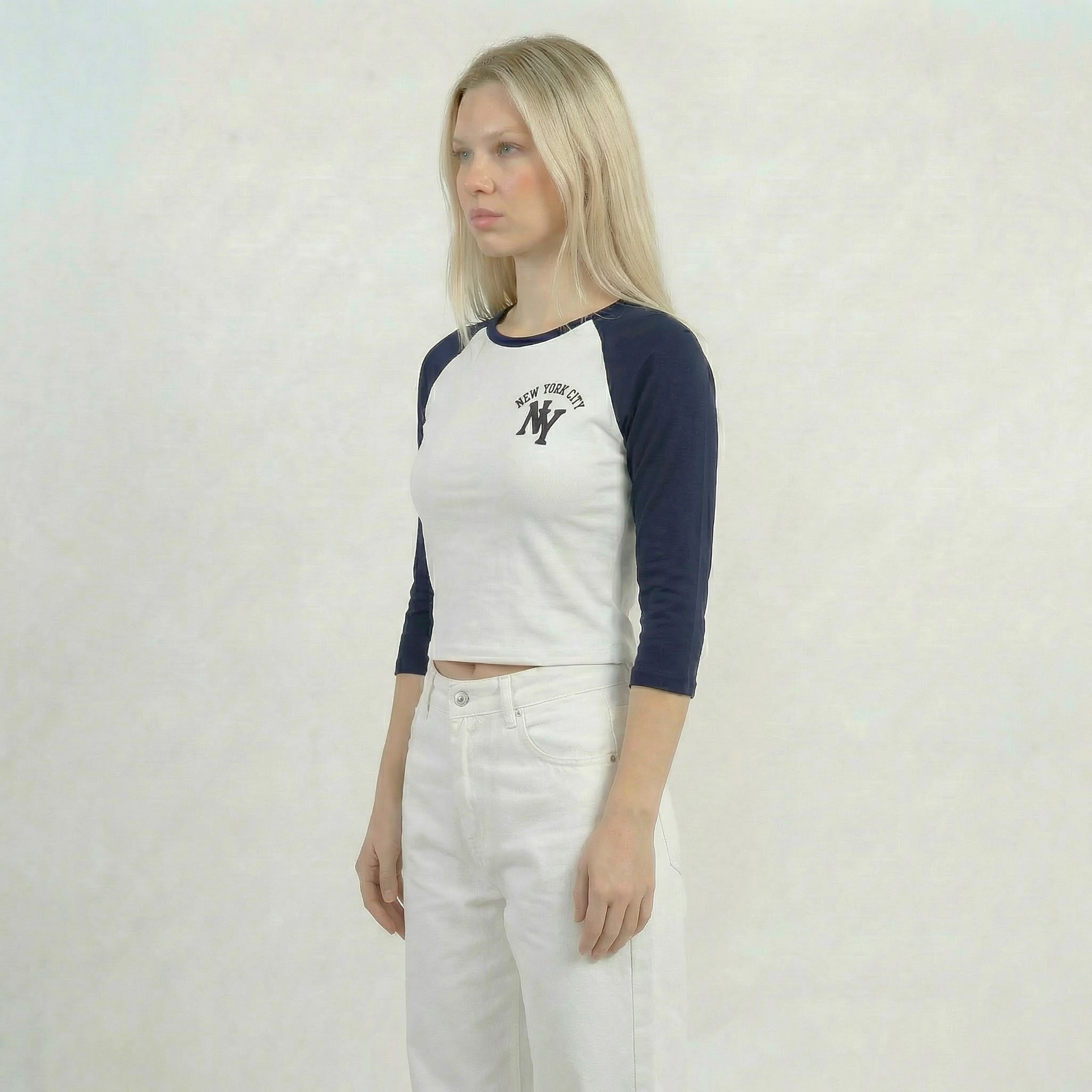 Remera de Ribb, manga ranglan 3/4, combinada y estampada.